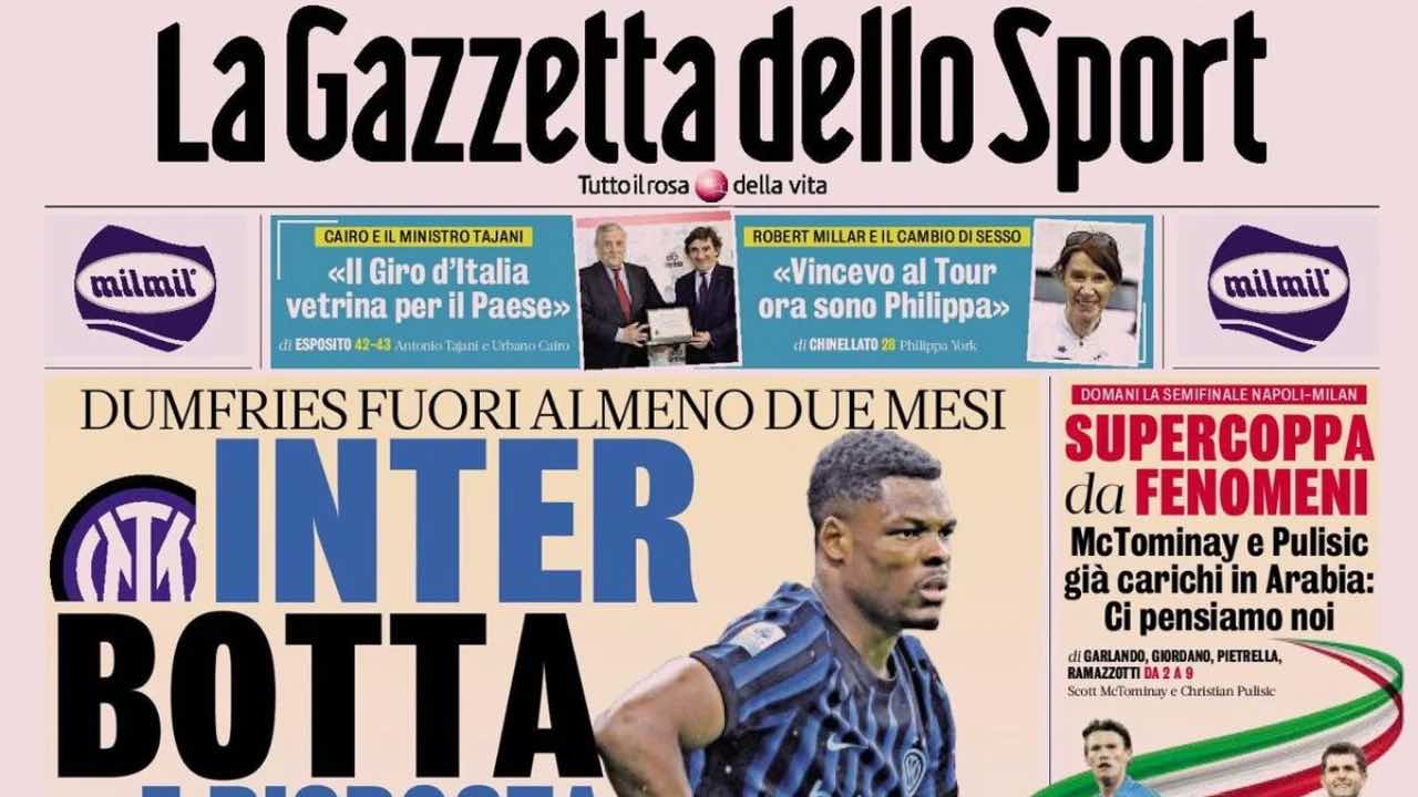 La Gazzetta dello Sport apre con l’infortunio di Dumfries, che si è operato alla caviglia e dunque rimarrà fuori tra i due e i tre mesi. Spazio anche alla Supercoppa Italiana, che comincerà con la prima semifinale tra Napoli e Milan.