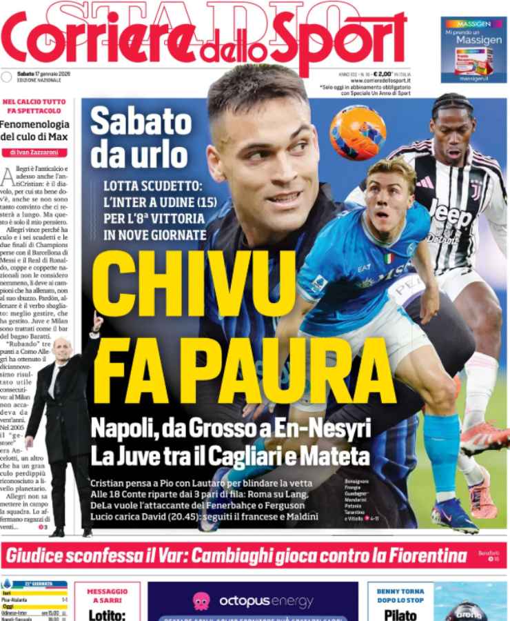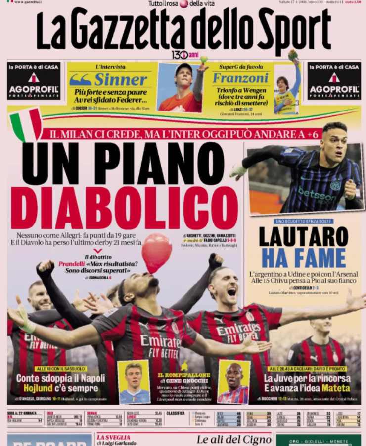 La Gazzetta dello Sport apre esaltando il Milan e Massimiliano Allegri, reduci da un super girone d’andata. Sulla destra focus sull’Inter, che vincendo oggi contro l’Udinese potrebbe andare a 6 lunghezze di distanza.