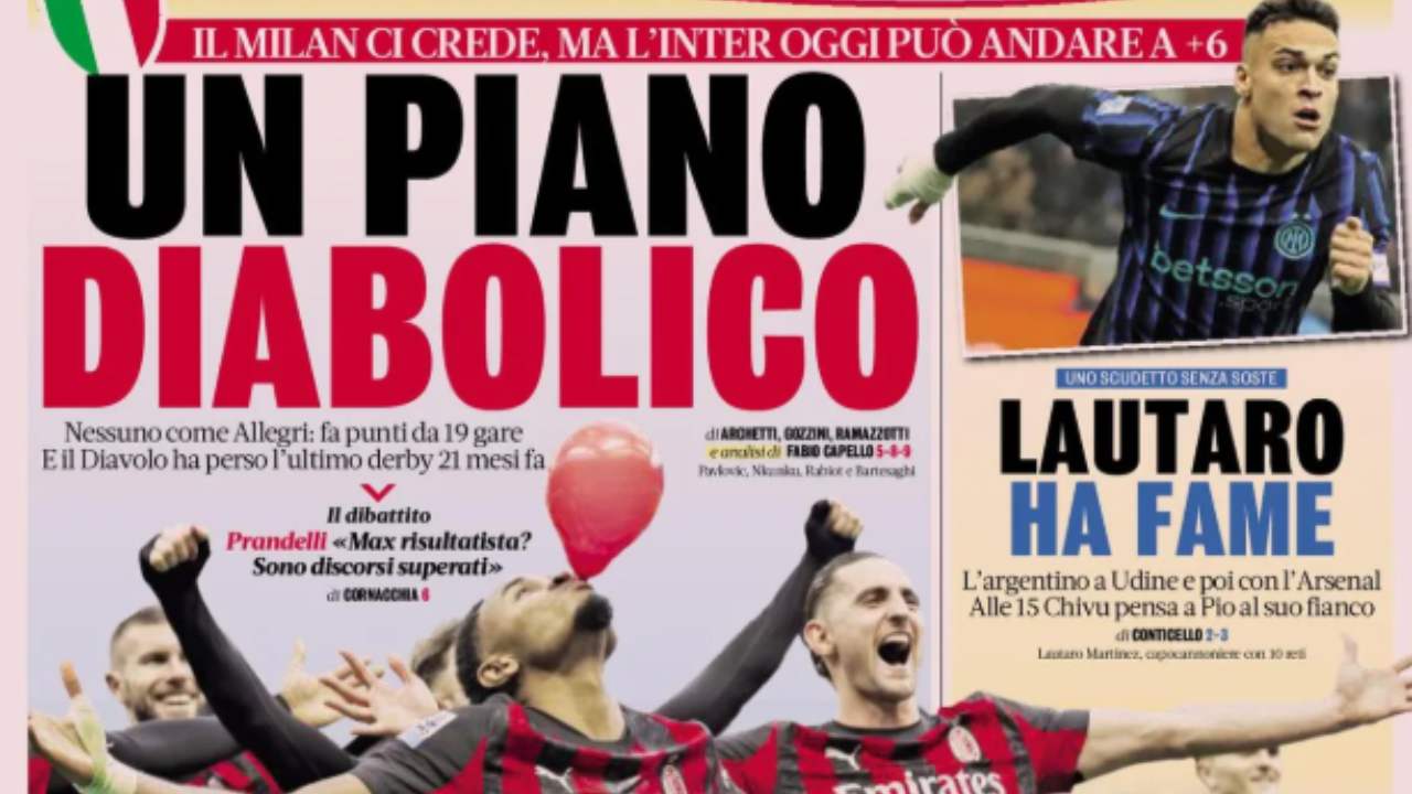 La Gazzetta dello Sport apre esaltando il Milan e Massimiliano Allegri, reduci da un super girone d’andata. Sulla destra focus sull’Inter, che vincendo oggi contro l’Udinese potrebbe andare a 6 lunghezze di distanza.