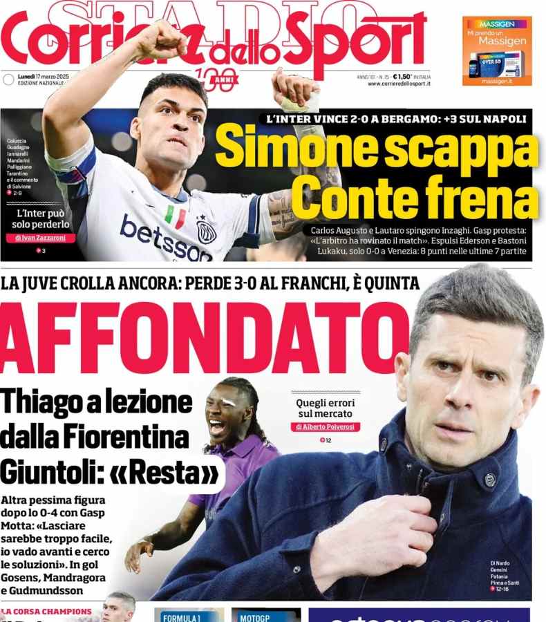 Prime pagine: “L’Inter scappa”; “Affondato”