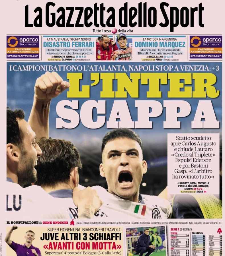 “L’Inter scappa” è il titolo della Gazzetta dello Sport, che dedica la prima pagina al successo dei nerazzurri ottenuto contro l’Atalanta. In basso, spazio alla vittoria della Fiorentina ai danni della Juventus.