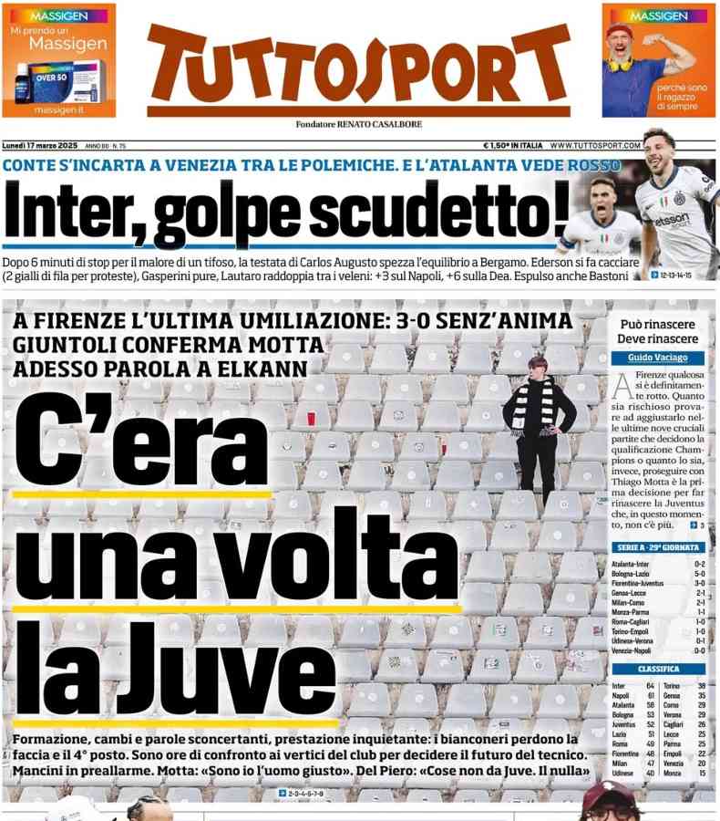 “C’era una volta la Juve”, titola così TuttoSport, facendo riferimento alla sconfitta dei bianconeri contro la Fiorentina. Anche in questo caso, in alto c’è spazio per l’Inter.