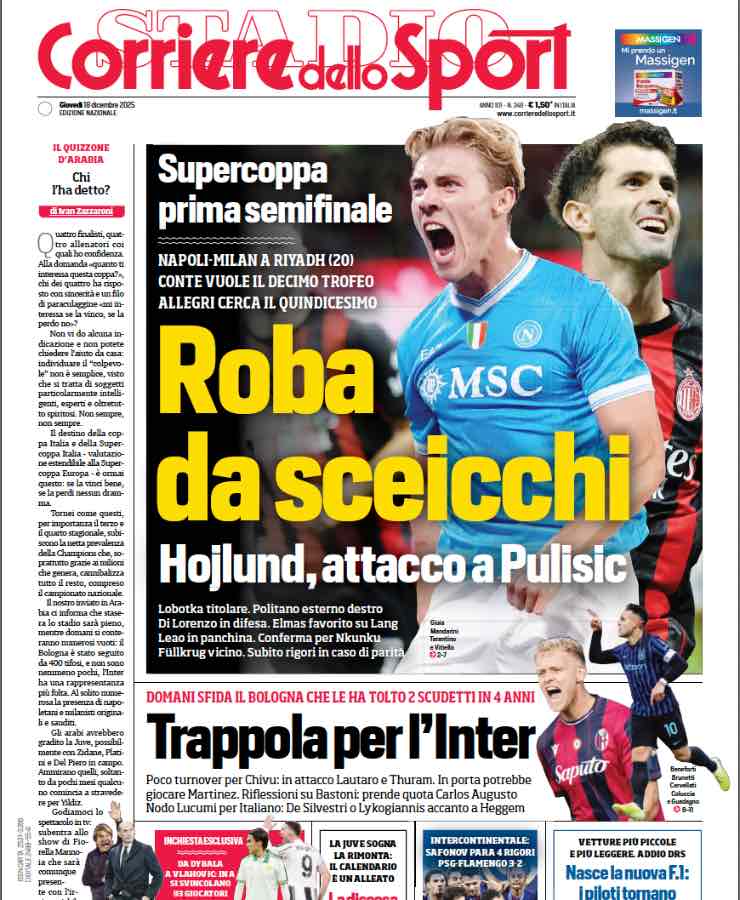 Anche il Corriere dello Sport apre con la sfida tra Napoli e Milan, dando spazio anche all’altra semifinale tra Inter e Bologna in programma venerdì 19 dicembre.