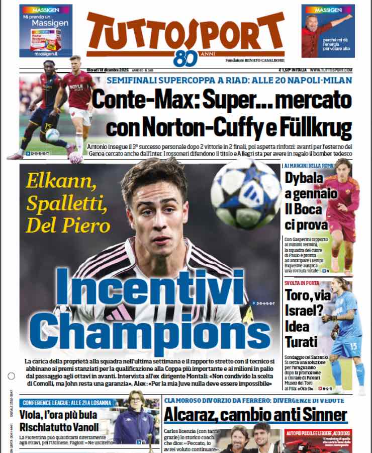 Le prime pagine dei principali quotidiani sportivi in edicola oggi, giovedì 18 dicembre 2025