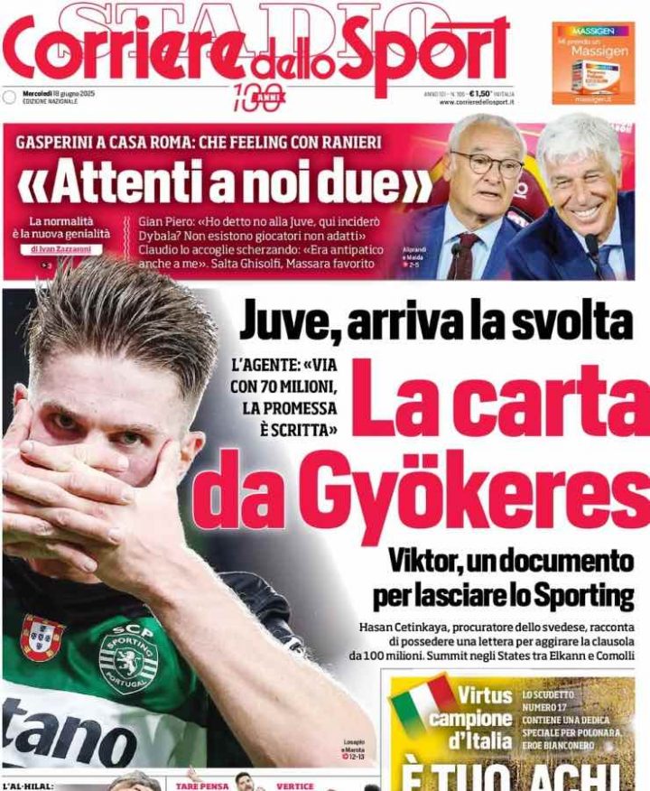 Il Corriere dello Sport, invece, apre con focus su Gyokeres. È sicuro che l’attaccante svedese lascerà lo Sporting: “Arriva la svolta”, anche se la concorrenza è sicuramente molto alta. Spazio anche a Gasperin-Ranieri dopo la conferenza di presentazione in giallorosso dell’ex Atalanta.