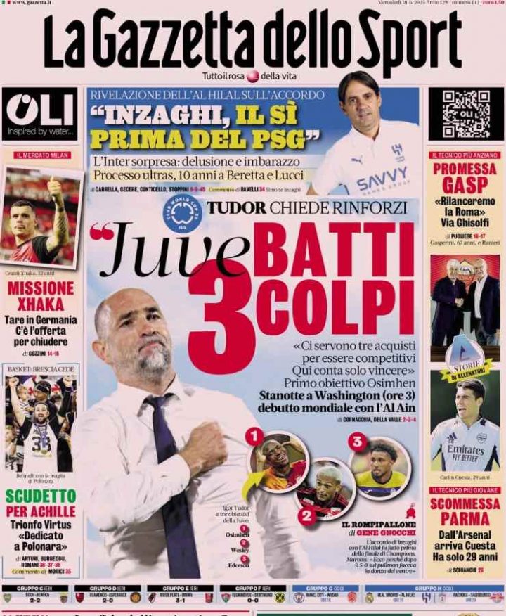 La Gazzetta dello Sport apre riportando le parole di Igor Tudor, che chiede tre rinforzi per essere competitivi ella stagione che verrà. Primo obiettivo Osimhen. In alto, invece, spazio anche alle rivelazioni della dirigenza dell’Al Hilal che ha confermato di aver trovato l’accordo con Simone Inzaghi già prima della finale di Champions League.