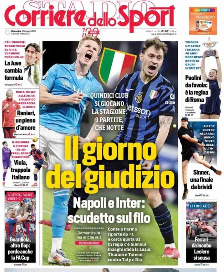Il Corriere dello Sport apre con “Il giorno del giudizio: Napoli e Inter Scudetto sul filo”. Infatti, in caso di vittoria azzurra contro il Parma e di sconfitta da parte degli uomini di Inzaghi contro la Lazio, la squadra allenata da Conte sarebbe aritmeticamente Campione d’Italia.