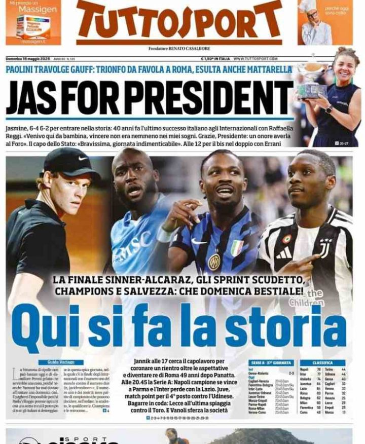 Anche Tuttosport apre con “Qui si fa la storia”, facendo riferimento sia alla corsa Scudetto che a quella per la Champions League delle squadre di Serie A. Taglio alto dedicato invece alla vittoria di Sinner agli Internazionali di Roma.