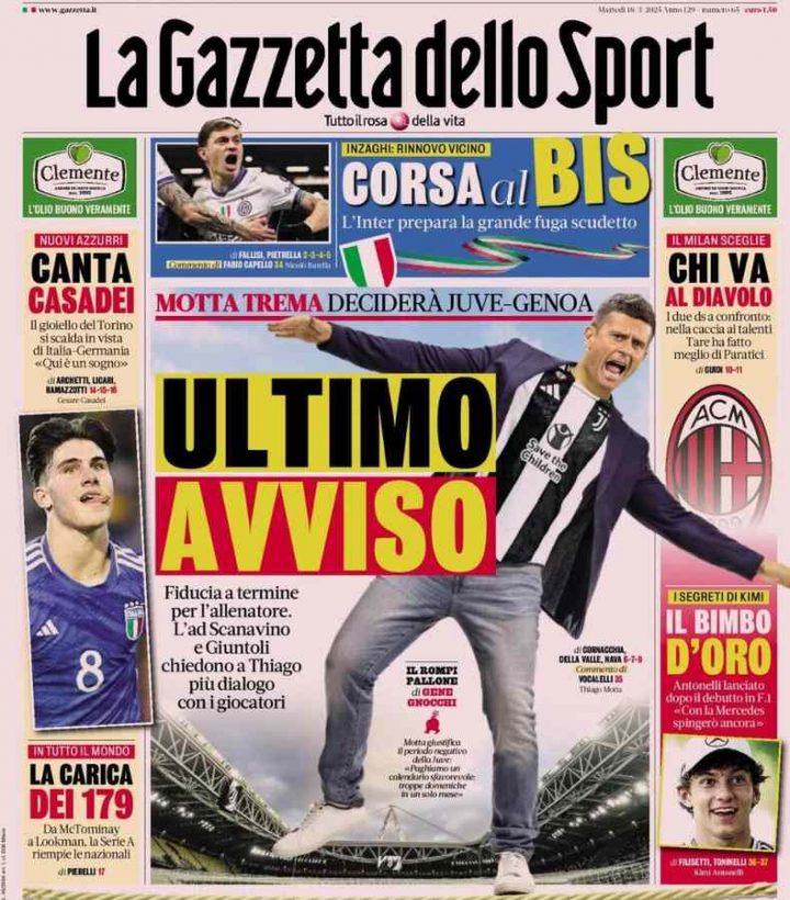 La Gazzetta dello Sport titola “Ultimo avviso” l’edizione odierna del giornale puntando l’attenzione sul momento della Juventus e sulla prossima partita in casa contro il Genoa, decisiva per il futuro di Thiago Motta sulla panchina bianconera.