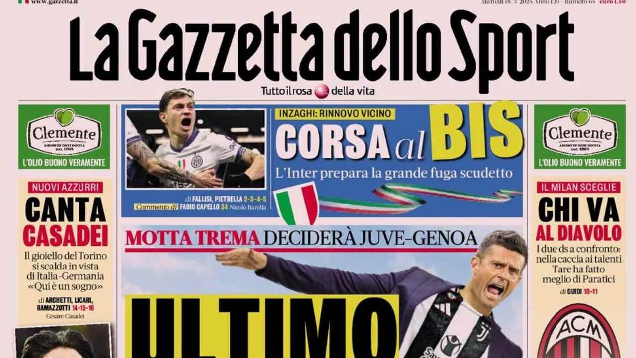 La Gazzetta dello Sport titola “Ultimo avviso” l’edizione odierna del giornale puntando l’attenzione sul momento della Juventus e sulla prossima partita in casa contro il Genoa, decisiva per il futuro di Thiago Motta sulla panchina bianconera.