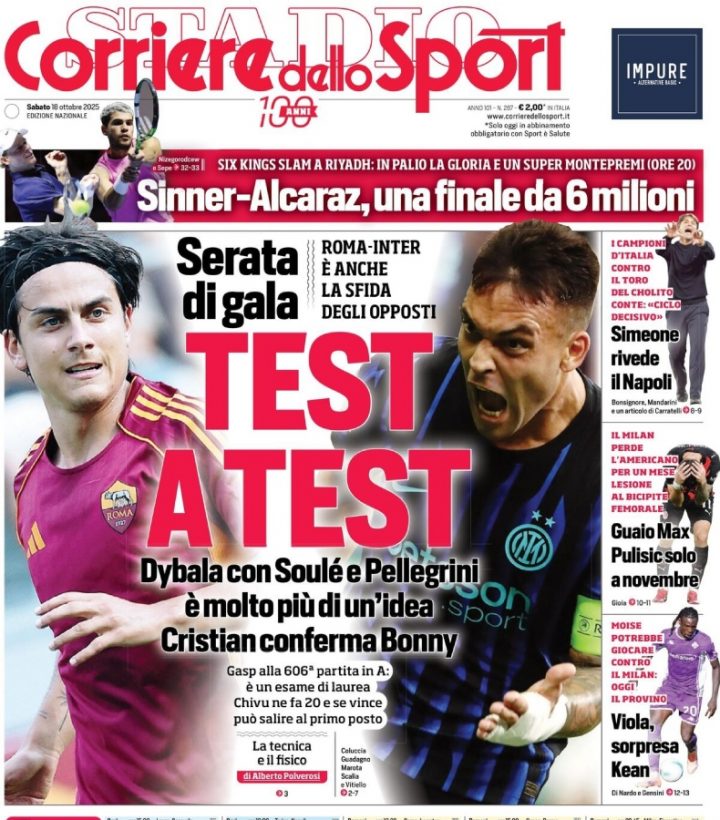 Anche il Corriere dello Sport apre concentrandosi sulla sfida tra Roma e Inter. Ma anche su Milan e sulla situazione legata al recupero di Kean. Spazio anche al tennis con la partita tra Sinner e Alcaraz.