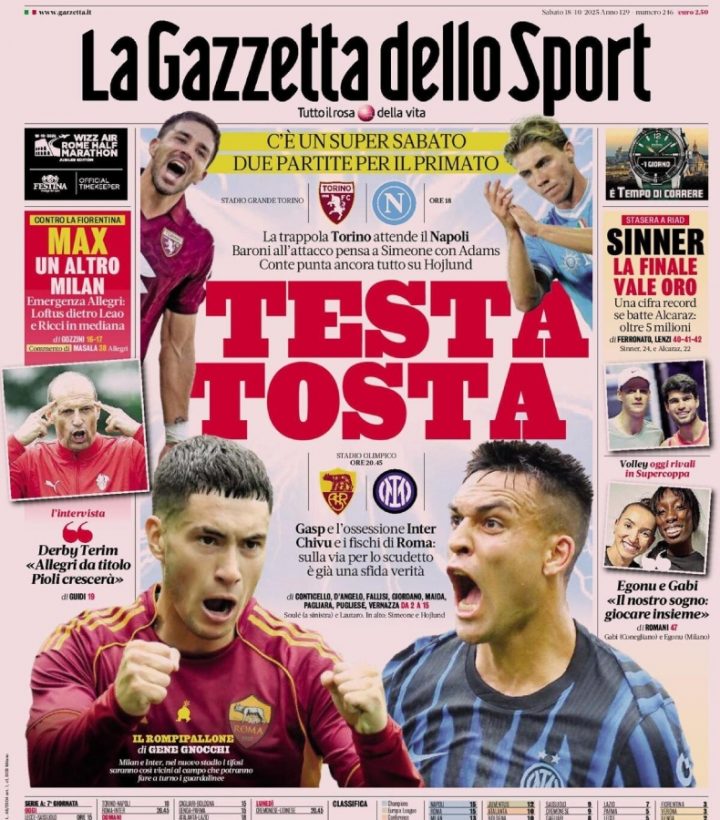 La Gazzetta dello Sport si concentra sul big match in programma questa sera tra Roma e Inter, oltre che su Torino-Napoli, altra grande partita del sabato. Spazio poi anche al Milan e alla situazione infortunati.