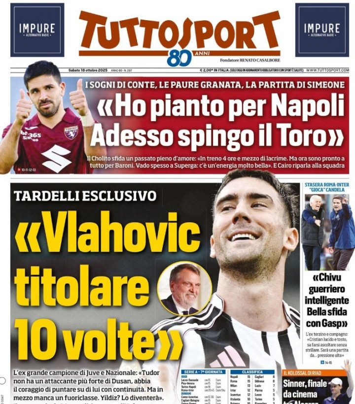 Tuttosport dedica ampio spazio a un’intervista esclusiva a Tardelli, oltre a un’intervista a Simeone sulla sfida alla sua ex squadra, il Napoli. Un focus, inoltre, anche sulla sfida tra Gasperini e Chivu.