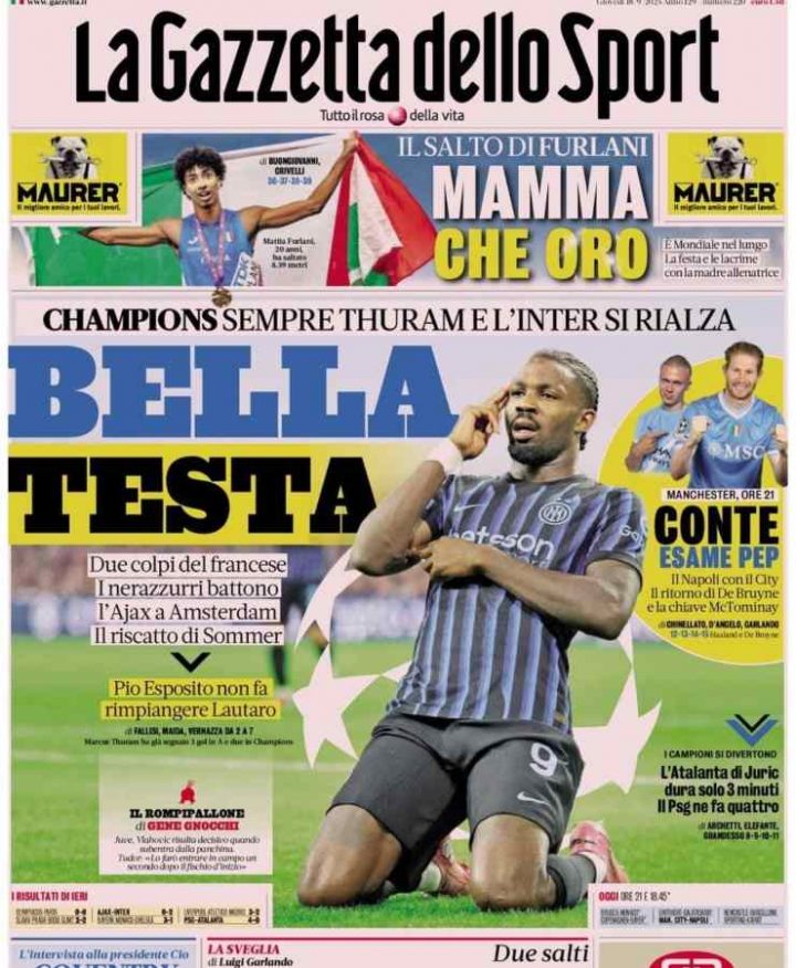 La Gazzetta dello Sport apre titolando sulla vittoria dell’Inter in Champions League contro l’Ajax. Due gol del francese sono bastati ai nerazzurri per battere la formazione olandese.