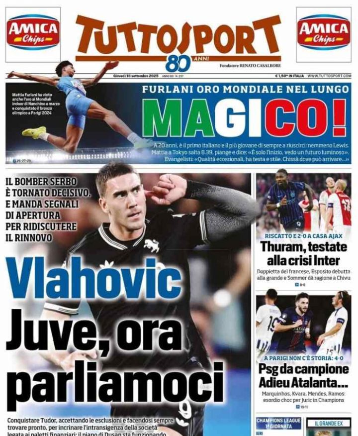 Tuttosport apre invece il suo quotidiano con “Vlahovic: Juve, ora parliamoci”: il serbo sta tornando decisivo a suon di gol con la sua squadra dopo un’estate difficile.