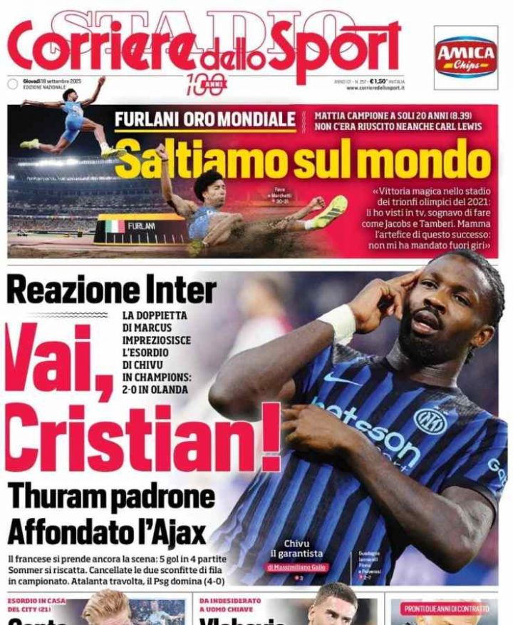 Anche il Corriere dello Sport titola sull’Inter con “Vai, Cristian”, celebrando quindi la vittoria di Chivu all’esordio in Champions League con i nerazzurri.