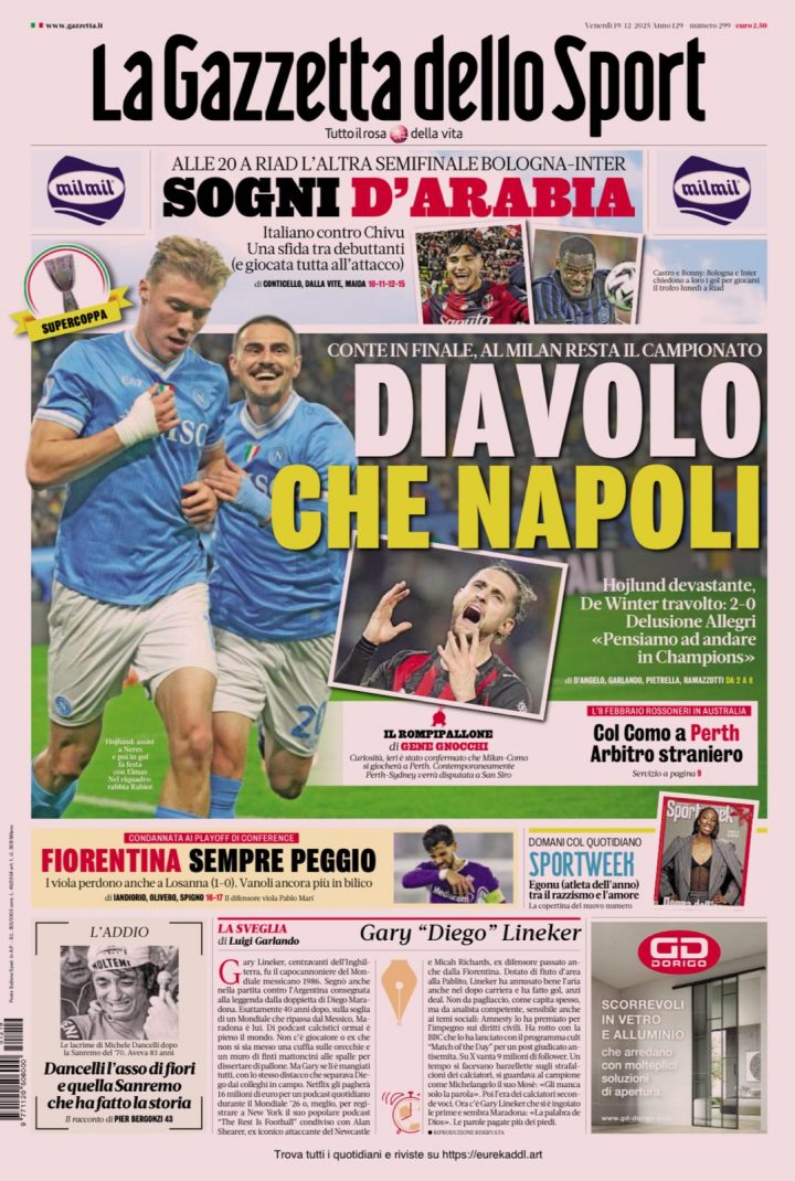 La Gazzetta dello Sport apre con la vittoria in Supercoppa Italiana del Napoli contro il Milan. Si legge poi una presentazione all’altra semifinale, quella tra Bologna e Inter e un approfondimento sulla Fiorentina, che ha perso anche in Conference League.