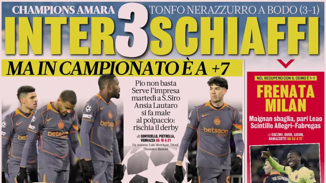 Inter protagonista anche sulla prima pagina de Il Corriere dello Sport che titola “Bodo Shaming”. Nonostante il pari dal Milan contro il Como e il +7 dei nerazzurri sui rossoneri in campionato, Chivu non è contento.