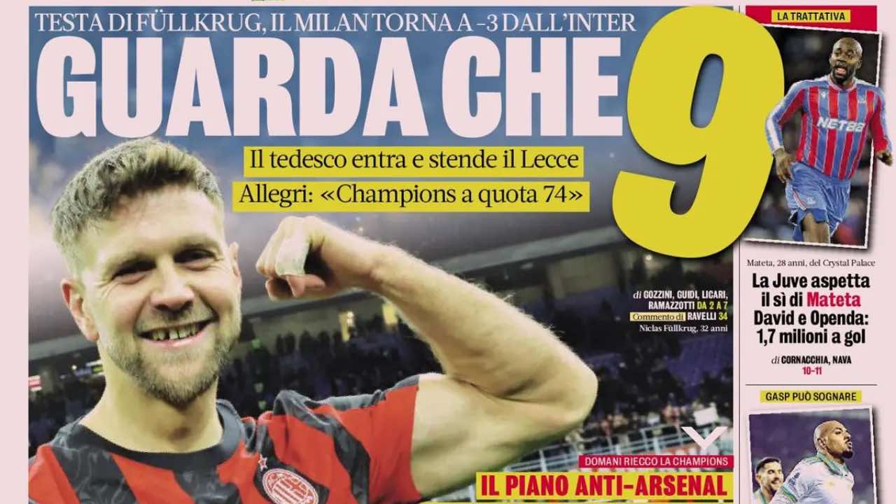La Gazzetta dello Sport apre con la vittoria del Milan contro il Lecce e il primo gol in maglia rossonera di Niclas Füllkrug