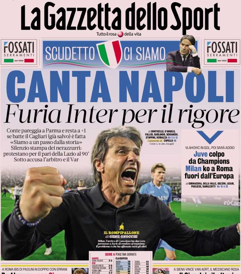 La Gazzetta dello Sport dedica ampio spazio alla corsa scudetto di Napoli e Inter.