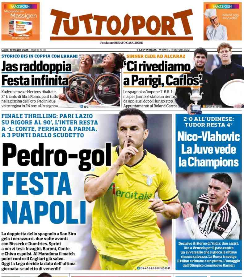 TuttoSport dedica la sua copertina a Pedro, autore di due reti del 2-2 tra Inter e Lazio. Spazio anche a Vlahovic e alla Juventus: contro l’Udinese finisce 2-0 per la squadra di Tudor.