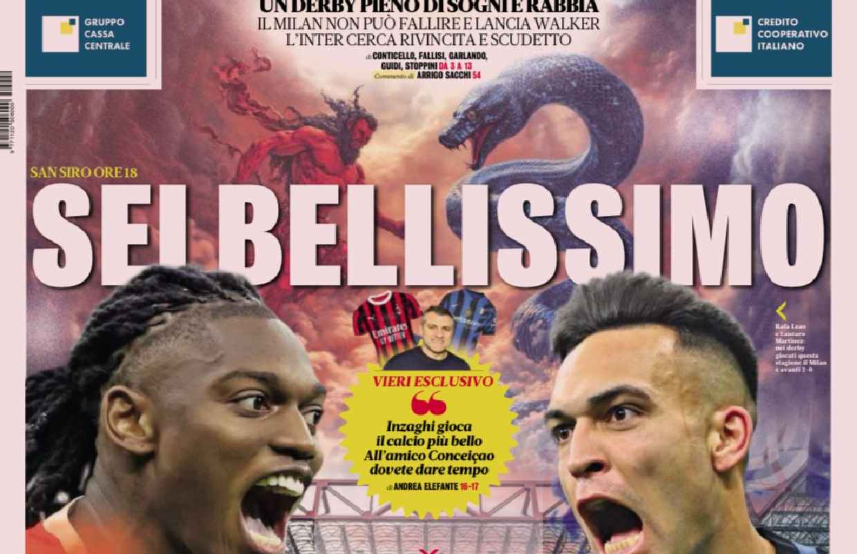 La Gazzetta dello Sport si concentra sul derby “Sei bellissimo”. Foto di Leao e Lautaro al centro, ma anche spazio a Gimenez: “Firma e va allo stadio: “Sono un grande club”.