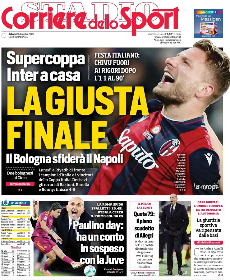 La Gazzetta dello Sport apre con la vittoria del Bologna ai rigori in Supercoppa italiana, mentre in alto spazio a Juventus-Roma in programma questa sera.