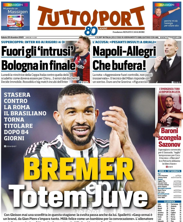 Tuttosport parla di Bremer e del ritorno del difensore brasiliano, mentre in alto spazio a Bologna e Napoli.