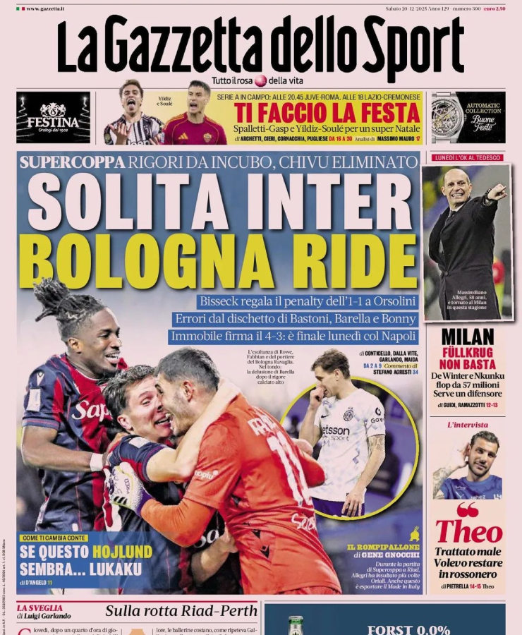 La Gazzetta dello Sport apre con la vittoria del Bologna ai rigori in Supercoppa italiana, mentre in alto spazio a Juventus-Roma in programma questa sera.