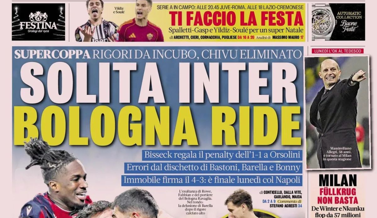 La Gazzetta dello Sport apre con la vittoria del Bologna ai rigori in Supercoppa italiana, mentre in alto spazio a Juventus-Roma in programma questa sera.