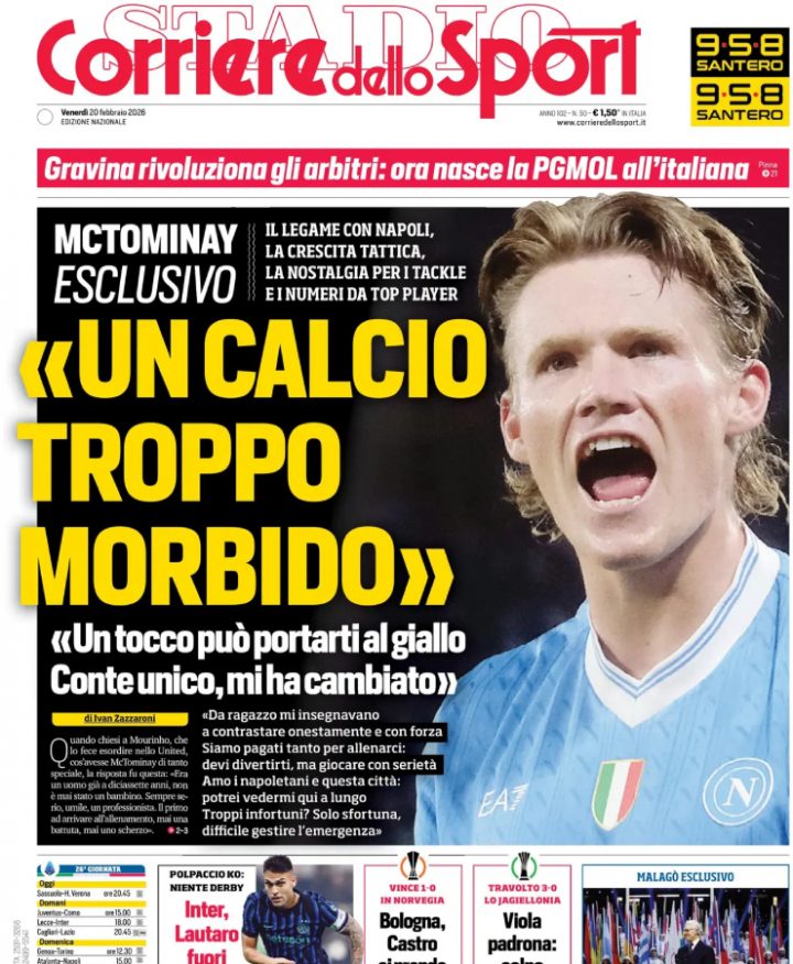 Il Corriere dello Sport apre con l’intervista a Scott McTominay, mentre in basso spazio alle vittorie di Bologna e Fiorentina in Europa