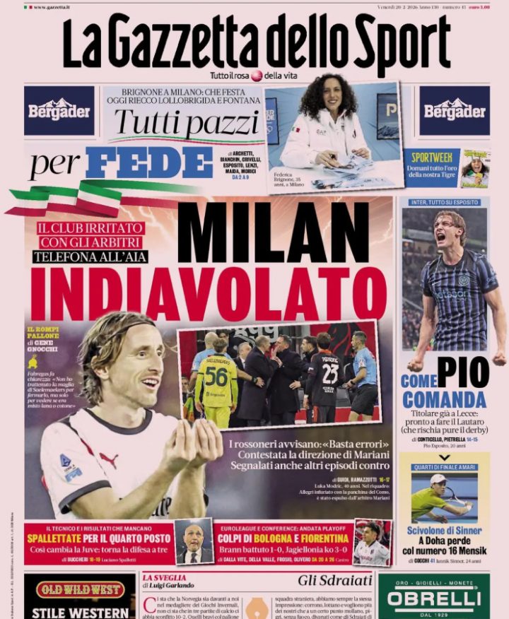 La Gazzetta dello Sport apre con il Milan e con gli errori arbitrali, mentre sulla destra trova spazio l’Inter con Pio Esposito.