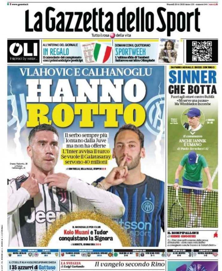 La Gazzetta dello Sport apre con Inter e Juventus, parlando delle possibili uscite: Dusan Vlahovic e Hakan Calhanoglu.