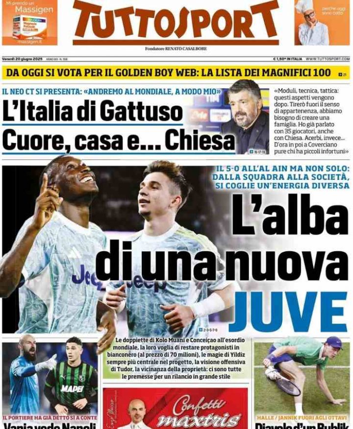 Anche Tuttosport parla di Juventus, dopo il 5-0 rifilato all’Al-Ain nel Mondiale per Club. In alto, trova spazio la conferenza stampa di presentazione del nuovo CT della Nazionale: Gennaro Gattuso.