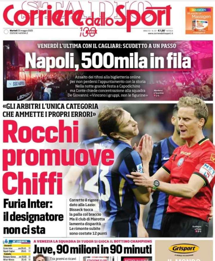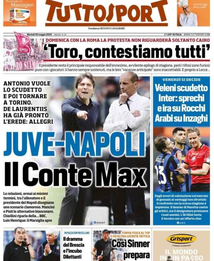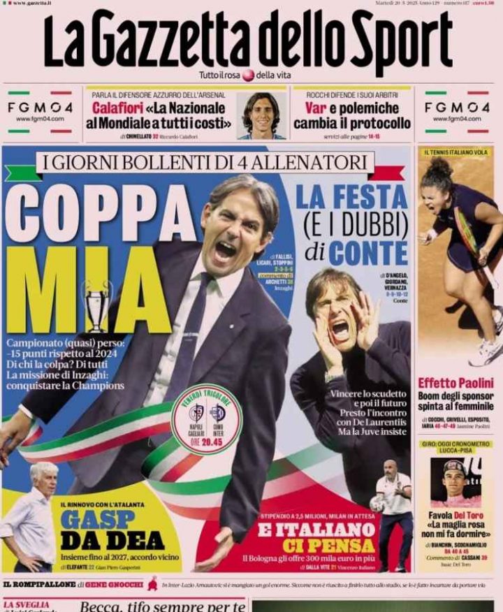 La Gazzetta dello Sport si concentra sulla lotta scudetto tra Napoli e Inter: Sarà decisiva l’ultima partita di Serie A che entrambi i club giocheranno venerdì 23 maggio alle 20:45. Spazio anche al futuro dell’allenatore dell’Atalanta Gasperini e all’allenatore del Bologna Italiano.Il Tuttosport apre sul futuro di Antonio Conte e Massimiliano Allegri. L’allenatore del Napoli però prima deve pensare allo Scudetto e poi si parlerà del futuro. Spazio anche alla protesta del Toro non solo contro il Presidente Cairo ma anche verso i giocatori granataIl Corriere dello Sport si concentra sulla vendita record dei biglietti per la sfida tra Napoli e Cagliari, oltre 500mila persone erano in attesa del loro biglietto. Spazio anche alle decisioni arbitrali della scorsa giornata di Serie A e alle parole di Rocchi proprio su questo tema