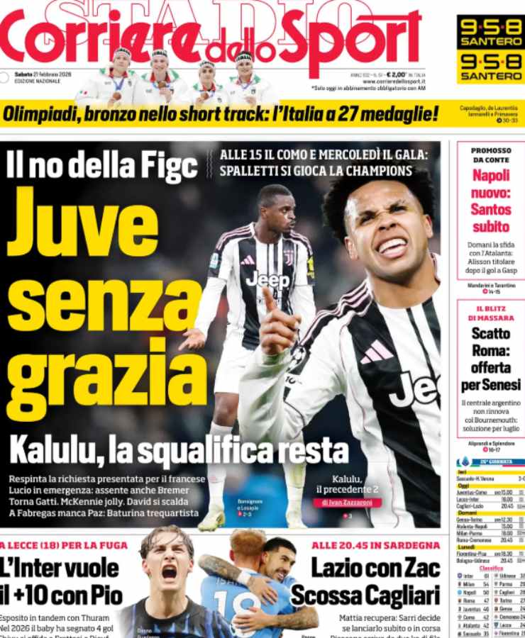 Il Corriere dello Sport si sofferma invece sul capitolo Kalulu, e nello specifico sulla richiesta di grazia respinta dalla FIGC. Anche qui, in basso, si pensa alle partite di giornata.