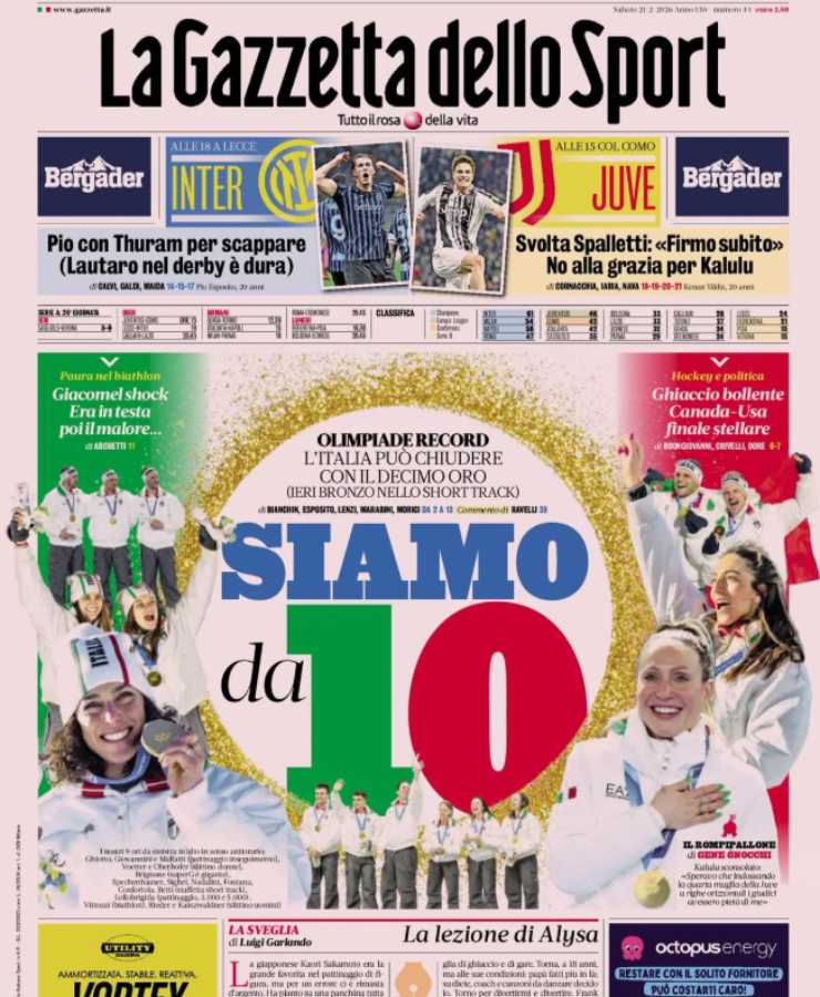 La gallery delle prime pagine dei principali quotidiani sportivi in edicola oggi, sabato 21 febbraio 2026.