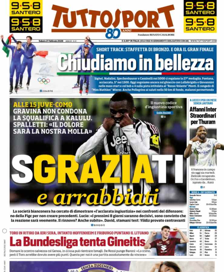 Discorso simile per Tuttosport, che analizza nel dettaglio il caso Kalulu. Nella parte superiore della pagina, invece, un focus sulle Olimpiadi e le ultime gare rimaste in programma.
