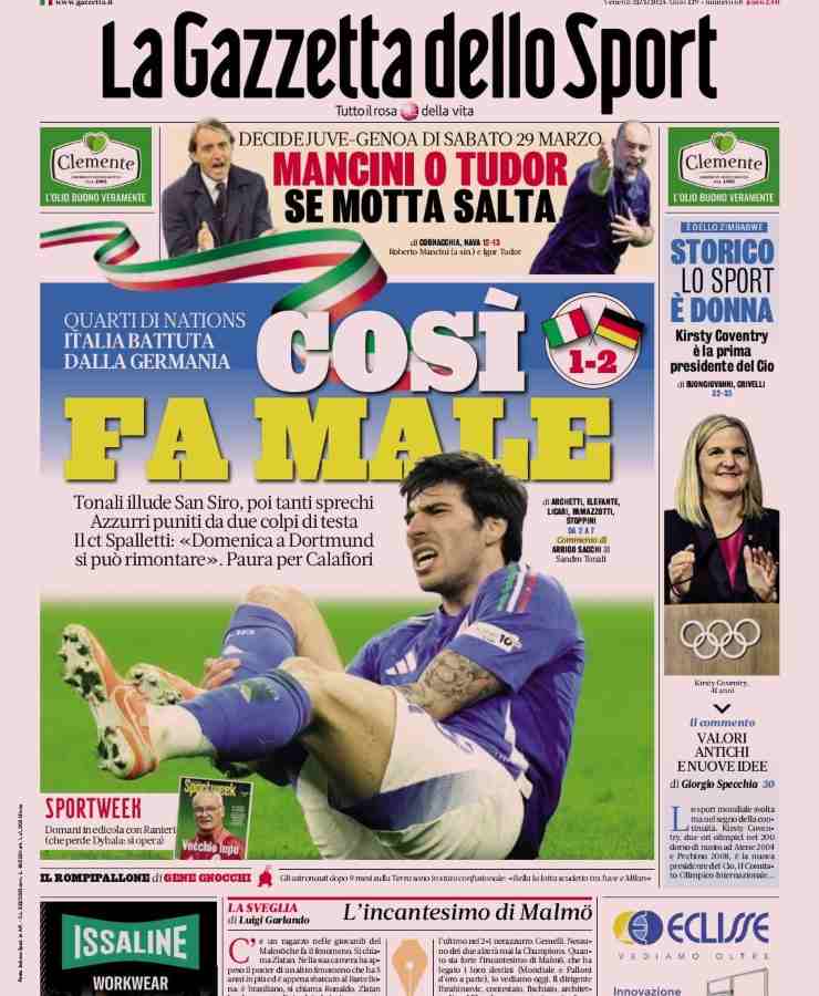 Il Corriere dello Sport apre sulla Nazionale, sottolineando i due gol subiti di testa contro i tedeschi allenati da Nagelsmann. Nonostante, però, la squadra di Spalletti abbia creato di più in fase offensiva. In basso, il punto sulla panchina Juve, con Tudor e Mancini pronti se dovesse saltare la panchina di Motta. Affianco, un riquadro dedicato all’infortunio di Dybala: stagione finita per lui.