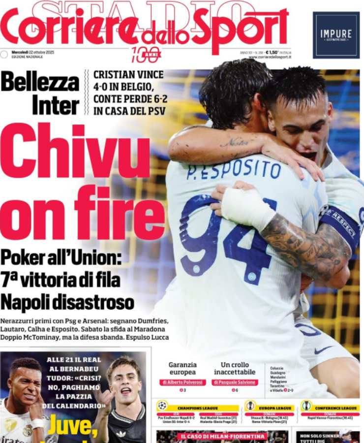 Discorso simile per Il Corriere dello Sport, che esalta il successo esterno della squadra di Chivu commentando invece il 6-2 di Eindhoven con un “Napoli disastroso“.