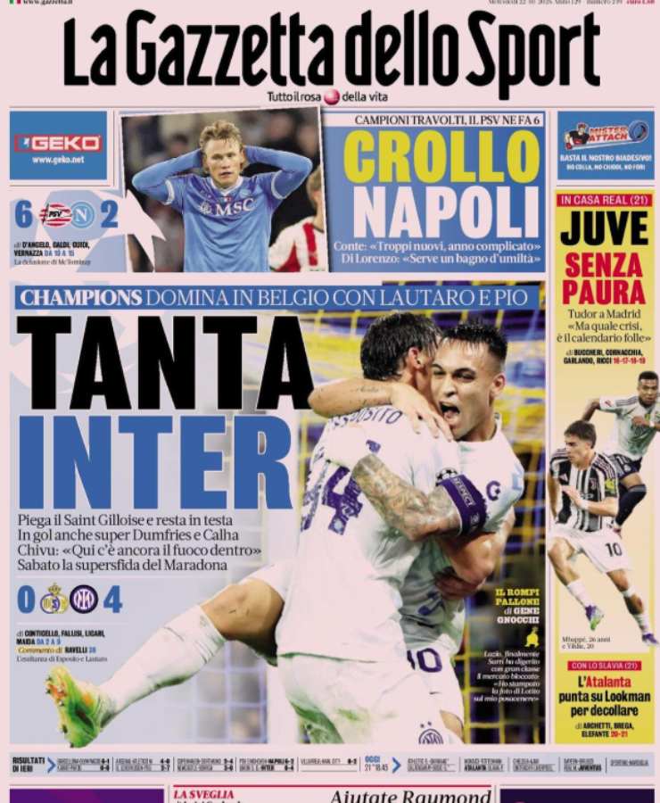 La Gazzetta dello Sport apre concentrandosi sulla grande vittoria esterna dell’Inter, mentre in alto il focus è sul crollo del Napoli in casa del PSV.