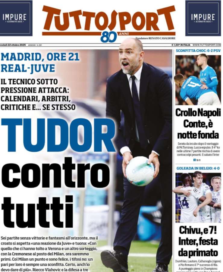 Tuttosport dedica invece gran parte della propria prima pagina a Igor Tudor, che in conferenza stampa alla vigilia della sfida contro il Real Madrid ha tuonato contro tutto e tutti.