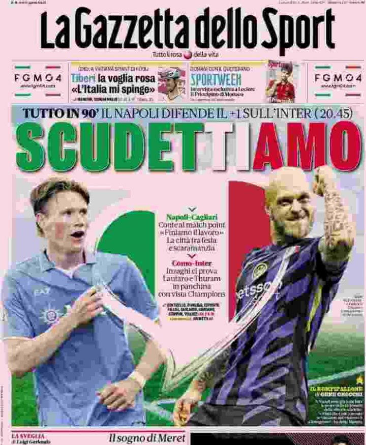 La Gazzetta dello Sport apre con la lotta scudetto tra Napoli e Inter: “Scudettiamo. Tutto in 90′: il Napoli difende il +1 sull’Inter (20-45)”. E poi: “Napoli-Cagliari. Conte al match point: Finiamo il lavoro. La città tra festa e scaramanzia” e “Como-Inter. Inzaghi ci prova. Lautaro e Thuram in panchina con vista Champions”. Taglio alto dedicato al Giro d’Italia: “Tiberi, la voglia rosa: L’Italia mi spinge”.
