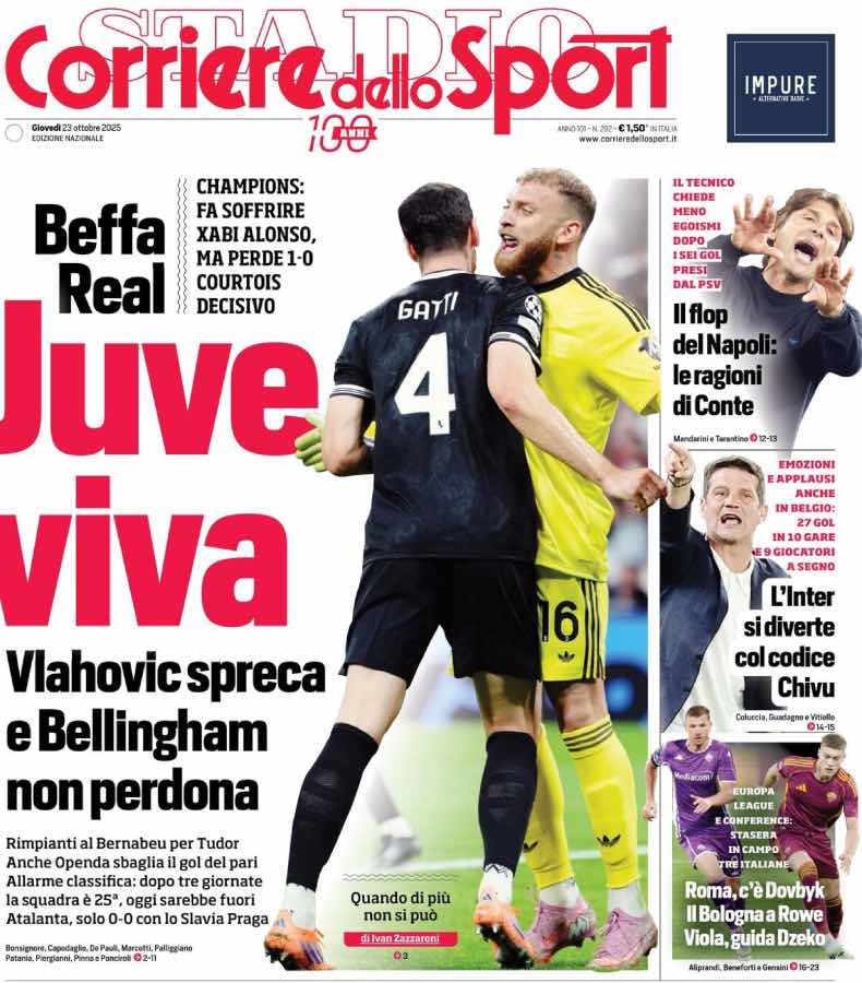 Anche il Corriere dello Sport dedica la sua prima pagina alla Juventus e al risultato ottenuto contro il Real Madrid.