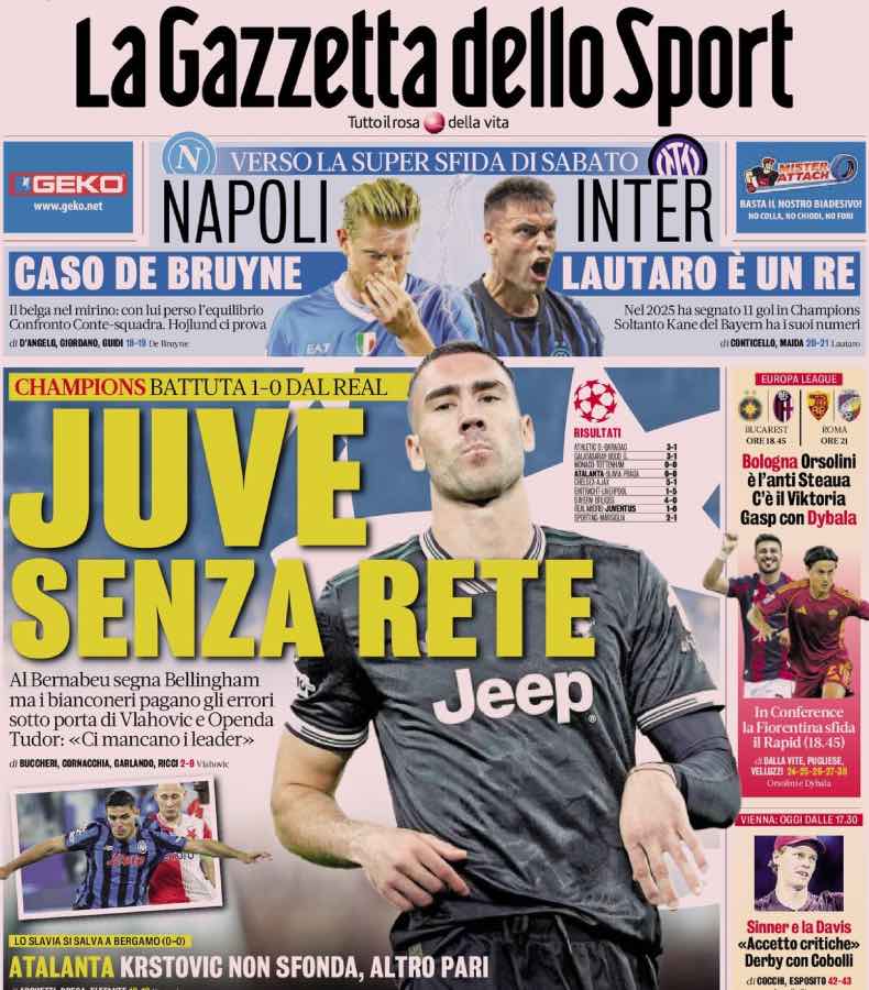 La Gazzetta dello Sport apre con la Juventus che, allo stadio Santiago Bernabeu, ha rimediato una sconfitta contro il Real Madrid nella sfida di Champions League.
