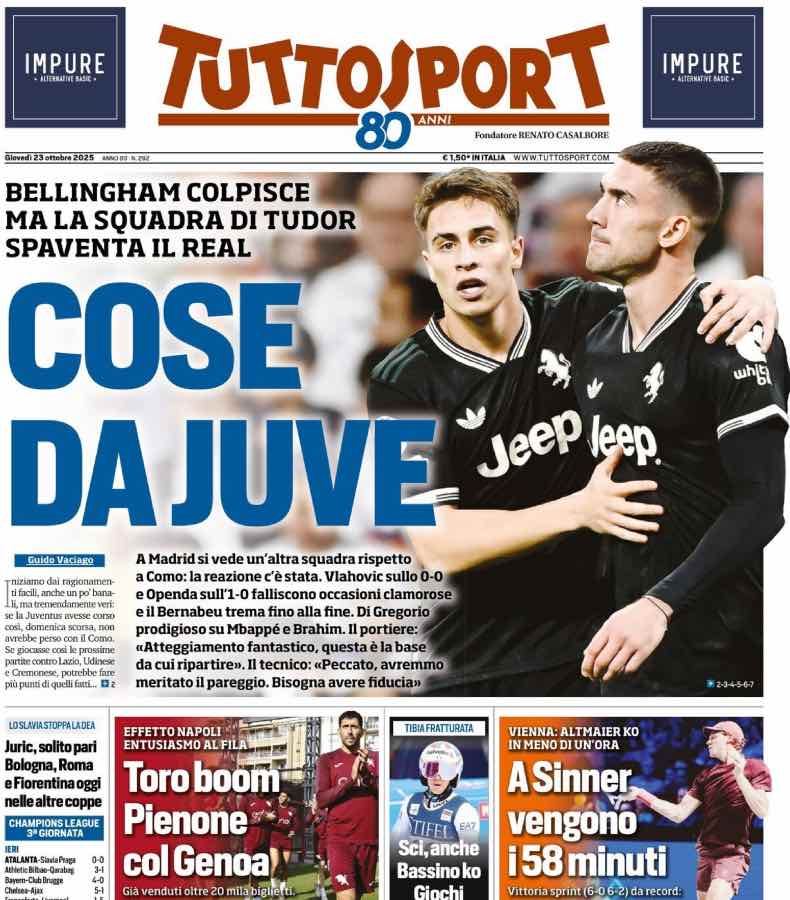 “Cose da Juve” è il titolo in prima pagina di TuttoSport. In basso c’è spazio anche per il Torino che, nel prossimo turno di Serie A, affronterà il Genoa.