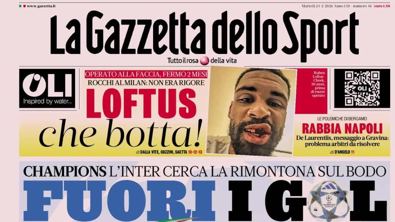 La Gazzetta dello Sport apre con la gara di ritorno tra Inter e Bodø/Glimt, in programma stasera – 24 febbraio – a San Siro. I nerazzurri dovranno recuperare dal 3-1 dell’andata. Spazio anche per Loftus-Cheek, che dopo lo scontro con Corvi si è operato e tornerà fra diverse settimane.