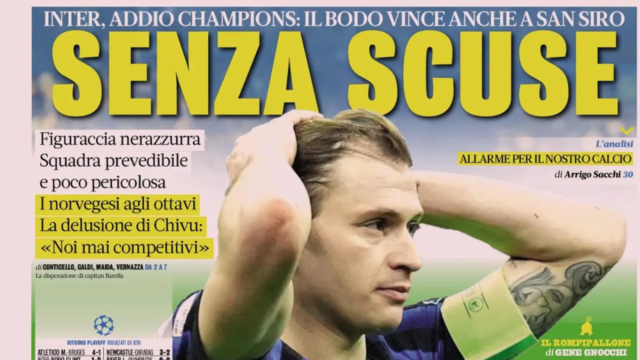 La Gazzetta dello Sport dedica la prima pagina all’eliminazione dell’Inter dalla Champions League, con l’1-2 del Bodo/Glimt a San Siro che interrompe il cammino europeo della squadra di Cristian Chivu. Oggi in campo Juventus e Atalanta, con l’obiettivo di rimontare Galatasaray e Borussia Dortmund.