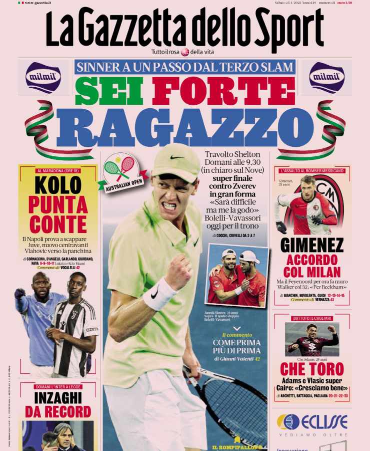 La Gazzetta dello Sport dedica la prima pagina al successo di Jannik Sinner contro Ben Shelton nelle semifinali degli Australian Open: un netto 3-0 che gli consente di accedere alla finale contro Zverev. Non solo tennis: c’è spazio anche per il calciomercato.