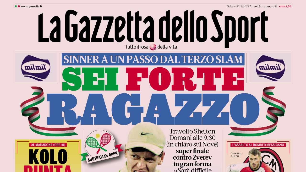 La Gazzetta dello Sport dedica la prima pagina al successo di Jannik Sinner contro Ben Shelton nelle semifinali degli Australian Open: un netto 3-0 che gli consente di accedere alla finale contro Zverev. Non solo tennis: c’è spazio anche per il calciomercato.